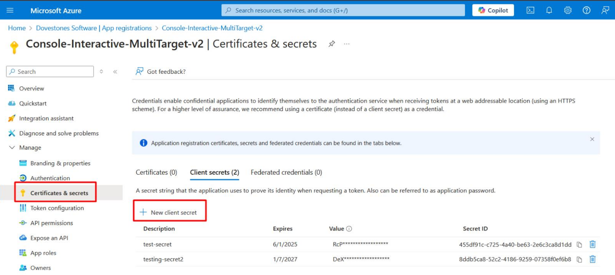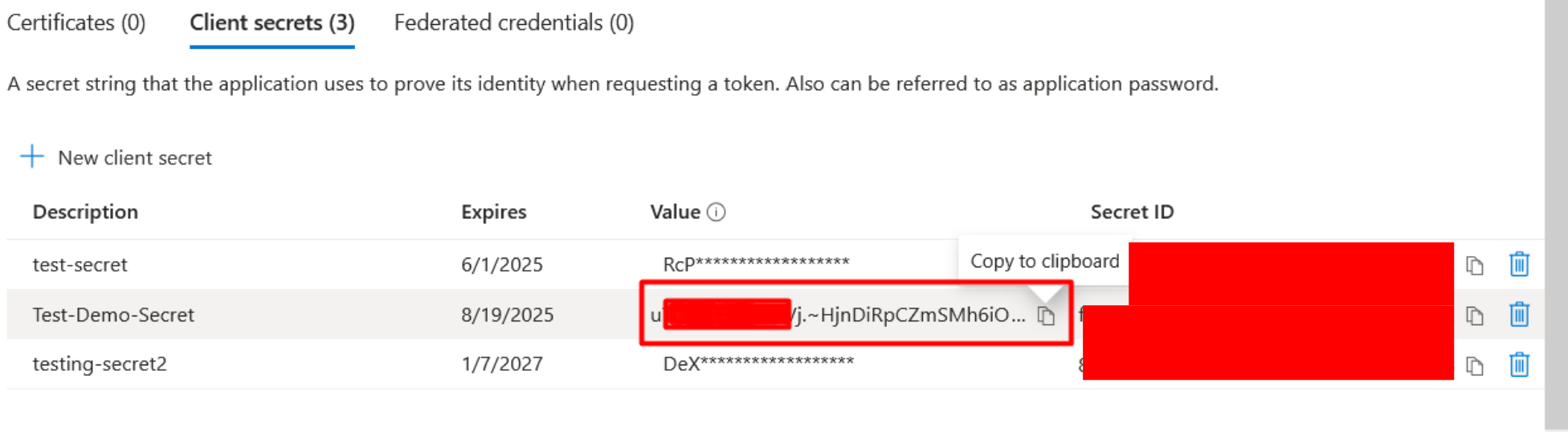 Copy the client secret value and store it securely, as it will no longer be visible after you leave or refresh the page. Make sure to save it immediately after creation.