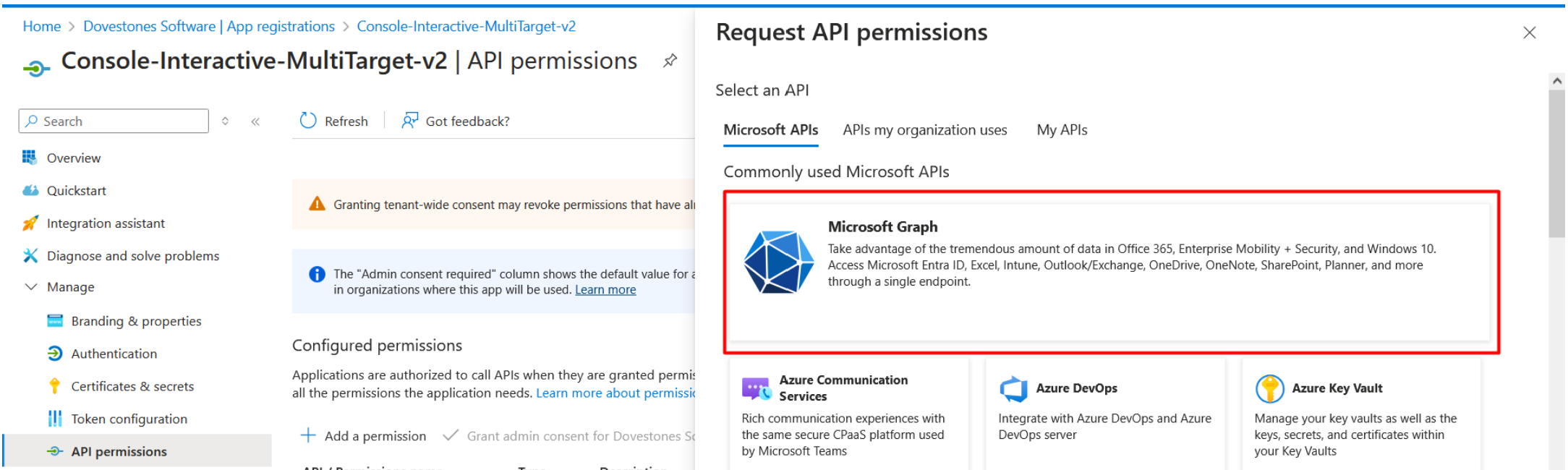 All the listed permissions are essential for the correct operation of the application. Please ensure that you add each of them in the API permissions section. Click “Add a permission”, then select Microsoft Graph to view all available permissions for Microsoft Graph.