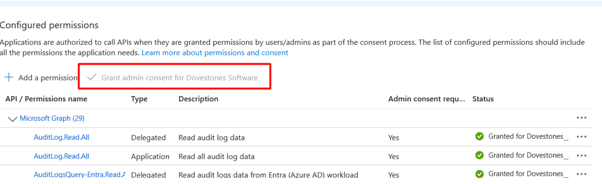 Some permissions require administrator consent for approval. These permissions can be granted by an administrator by clicking the “Grant admin consent” button in the API permissions section.